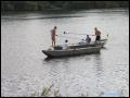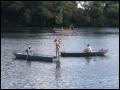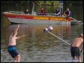 | Daß das Fischerstechen diesmal nicht wie üblich auch am Fischerfest-Sonntag stattfand, war etwas ungewöhnlich, hing aber damit zusammen, dass an diesem besagtem Sonntag ganze Ozeane aus dem Himmel fielen. Somit wurde entschieden, das Fischerstechen auf unser Jubiläum zu vertagen, was sich letztendlich -wettertechnisch- als einen Glücksgriff herausstellte. Bei schönstem Wetter stiegen dann 3 Damen und 7 Herren nacheinander in zwei Boote, um sich danach dann wieder herunterzustossen.