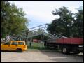 | Gleich nach der Modenschau ging es dann auch im Aussenbereich mit einer feuerwehrtechnischen Vorführung weiter. Die Höhenrettungsgruppe Main-Taunus - bestehend aus den Wehren in Sulzbach, Hattersheim und Bad Soden - zeigte ihr Können an einer ausgefahrenen Drehleiter, die rückwärts (also von unten!) bestiegen wurde, oder seilten sich von der Leiter aus grösserer Höhe ab.